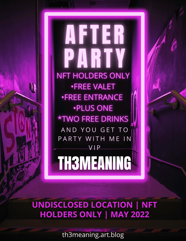 The event is a after party that only NFT holders can attend. After showing your NFT at the door you’ll receive a Red envelope with discount codes for shirts for shows, tickets for your drinks, VIP Bands and a thank you note from TH3 Meaning.